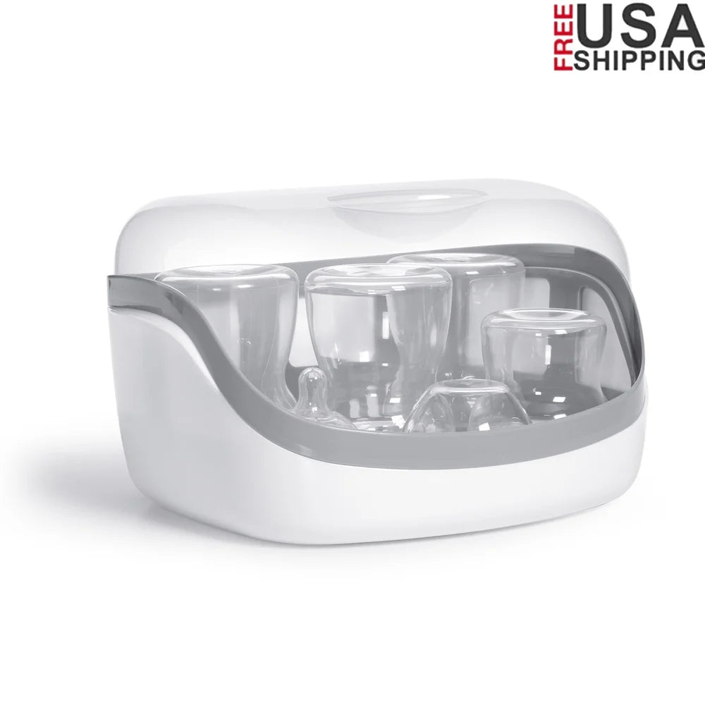 Sanitize naturally with the power of steam. The immune systems of newborns are still developing so it’s important to disinfect bottles, nipples, pacifiers, and other feeding items. It’s BPA-free and PVC-free. Using tap water, the process takes only a few minutes and involves NO CHEMICALS. The steam generated kills harmful household germs. You can sanitize 4 wide mouth or 5 regular bottles and parts. Contents remain sanitized for 24 hours if the lid is not removed. Tongs are included. *Only microwave-safe items should be placed in sterilizer